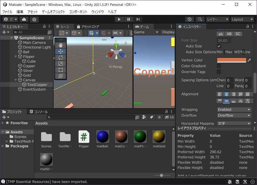 - 球を銅のマトに当てたら「Copper!」と表示されることを確認